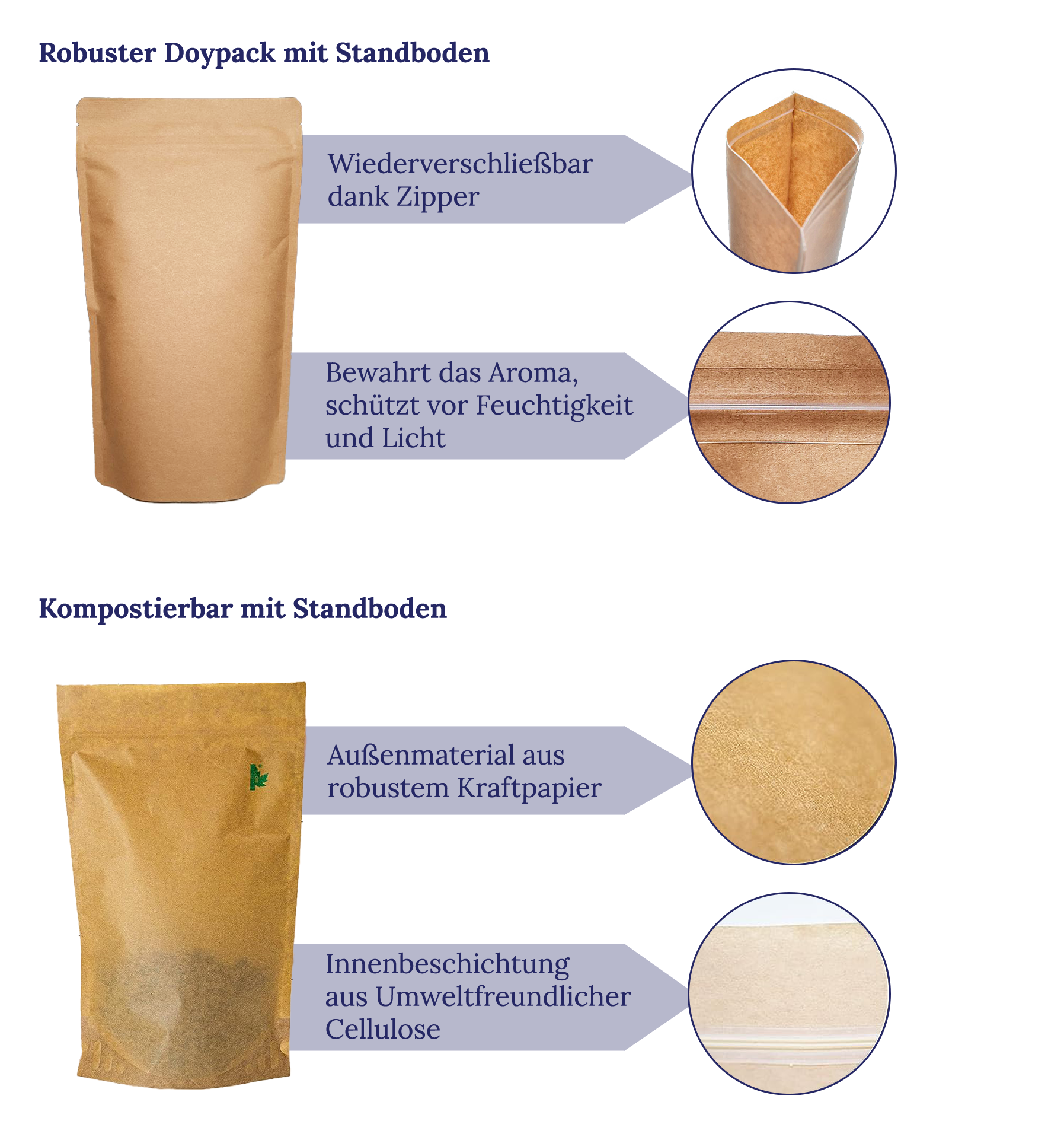 So bieten wir z.B. verschiedene Doypacks, unter anderem aus biologisch abbaubaren Materialien, auch Behälter aus Glas oder anderen Materialien sind kein Problem.